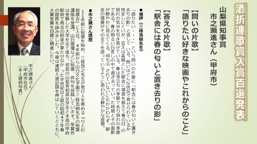 100選の詳細及び選評は酒折連歌賞HPをご覧ください。