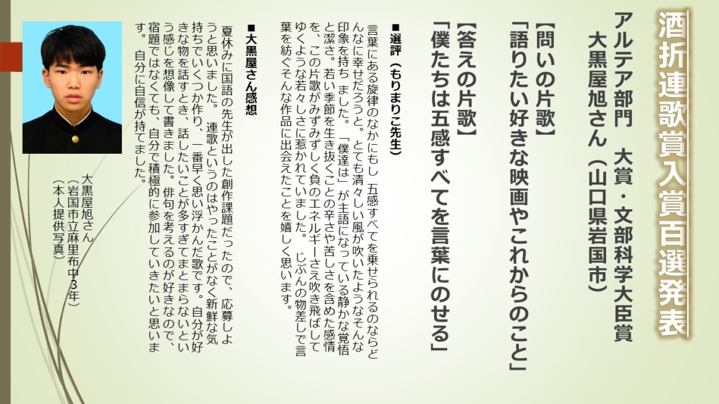 今年度の大会応募句数は27,836句、北は北海道から南は沖縄まで全国各地からたくさんの応募句が寄せられ、海外からも投稿が寄せられた。男女別は男性54%、女性45%(不明1%)、年代別は10代が65%を占め、次いで70代が11%。60代が7%と続く。今年の最高齢は102歳、最年少は7歳だった。中学・高校の授業の一環で取り組む学校が多く中高生の応募が非常に多いことが特徴の文学賞となっている。大賞からアルテア賞最優秀までの上位5作品の作者は、女性3人、男性2人、うち2人は中高生となった。表彰式は上位受賞者を招き2月14日(土)に山梨学院大学クリスタルタワー7階山梨学院広報スタジオで行われる。