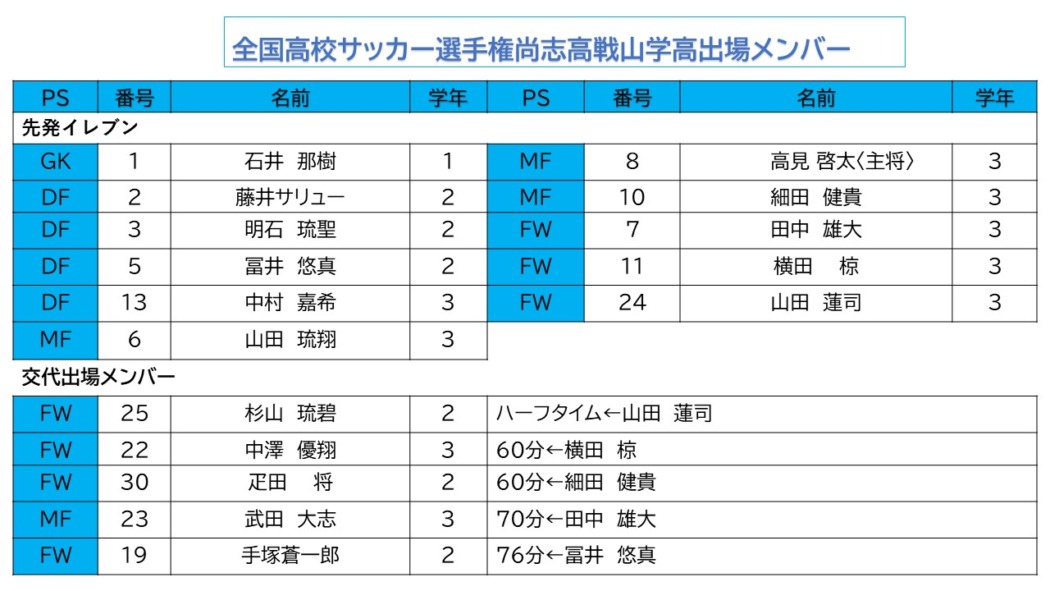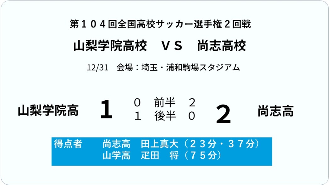 試合が動いたのは前半23分だった。ロングスローからのこぼれ球をプリンスリーグ東北の得点王10番田上真大選手に押し込まれて先制された。さらに37分に田上選手に2点目を奪われ非常に厳しい展開で前半を折り返した。後半の山学高はせめだるまとなって猛反撃を開始した。前から前からプレッシャーをかけ、後半22分には後半から起用のFW杉山琉碧(2年)がGKへのバックパスをカットしてあと少しでゴールのシーンを作り出し、35分に30番疋田将(2年)が後方からのクロスボールに俊敏に反応して体を反転させ、左足を振り抜きゴールネットに突き刺した。これで1-2、山学風林火山軍はひたすらゴールへ、ゴールへ火の如く攻め上がった。しかし、あと一歩、あと1点、届かなかった。アディショナルタイムの3分が経過し試合終了の笛。年越しはならず、5年ぶりの国立への道は断たれた。県大会準決勝の反則でこの試合まで3試合出場停止処分のエースストライカー、オノボ・フランシス日華(3年)は、選手権ピッチに立つこと叶わず無念を胸に高校サッカーを終えた。この大会の応援リーダー日本代表FW前田大然選手は山学高1年の時に規律違反で除籍となり高2の1年間は練習もできなかった。高3になって処分が解除されてピッチに戻れたが、チームは県大会決勝で敗れ選手権の舞台に立つことは叶わなかった。先輩はそこから自分を見つめ直し、自分を鍛えて階段を一段一段上がって世界に羽ばたいた。オノボもこの悔しさを糧にして先輩のように自分を見つめ直し、人間的に成長して、自分の力で自分の未来を切り開いてほしい。