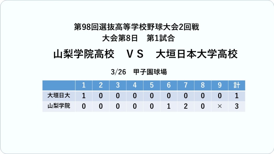 第98回選抜高校野球大会第8日は3月26日、兵庫県西宮市の甲子園球場で2回戦4試合が行われ、山梨学院は大垣日大(岐阜)と対戦、3対1と逆転で破り2年ぶりにベスト8に進出した。