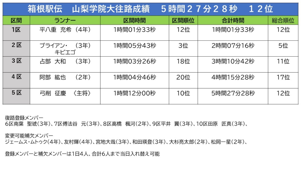 山学大の往路12位はシード権を獲得した2016年以来の高順位。合計タイム5時間27分28秒はシード権内の10位東海大とは1分18秒差。壮行会で「選手は私以上に本気でシード権を取るという気持ちでいます。必ず皆さんの心に響くような走りをしてくれると思います」と話していた大﨑悟史監督は往路後の取材に対し「復路でシード権にもっていくことは十分可能」と復路の選手の走りに期待を寄せた。