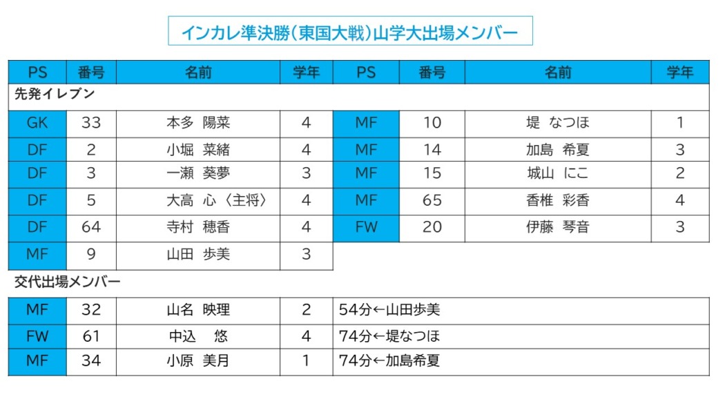 大学日本一を決める“インカレ”「全日本大学女子サッカー選手権」準決勝で山学大女子サッカー部が、またしても劇的に勝利をつかみ取った。後半終了寸前のアディショナルタイムだった。後半途中投入のFW中込悠がゴール前に絶妙のクロス、これを最後尾から駆け上がってきた攻撃的ディフェンダー一瀬葵夢が左足を振り抜き、ゴールネットに突き刺してついに均衡を破った。その1分後に試合終了の笛。東京国際大を1-0で下し、昨年逃した優勝旗奪還に王手をかけた。