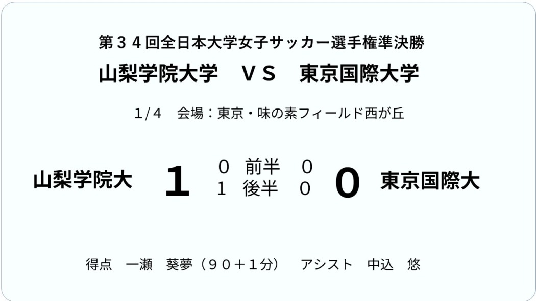 準決勝の舞台は、選手たちがそこでプレーすることを目標に1年間練習に取り組んできたリベンジを果たす地、東京・味の素フィールド西が丘。山学大女子サッカー部は、創部10年目だった2年前、この地で初の大学日本一を獲得し、昨年は決勝で日体大に敗れて2連覇を逃し準優勝に終わった。今年のチームは西が丘で優勝旗を奪還するために、春・夏・秋・そしてこの冬まで、力と技とチームプレーを高めることにひたすら努めてきた。年末に大阪・ヤンマースタジアム長居で行われた準々決勝の東洋大戦で、敗戦寸前のアディショナルタイムに後半途中出場FW中込悠(4年)の同点ゴールで追いつき、GK本多陽菜(4年)がPKを2本止めて劇的大逆転勝利で勝ち上がり西が丘にやってきた。チームにとって準決勝は、ここまで来て負けるわけにはいかない試合だった。相手の東京国際大も強かった。押し込んでも決定的場面は作れない、カウンター攻撃で素早く仕掛けてくる、前半も後半も一進一退、どちらも点が入らない。準決勝からは90分で決着がつかない場合は、延長戦に突入するルール。ライブ配信の実況アナが「アディショナルタイムに入りました。このままだと延長戦です」と言った直後だった。この試合も後半途中から投入された中込悠(はるか)(韮崎高出身で3年まではセカンドチーム、努力を重ね最終学年になってファーストチーム昇格をつかみ取った努力の人)がゴール前に絶妙のクロスを上げ、サイドバックから駆け上がってきた攻撃力を兼ね備えたDF一瀬葵夢(あみ)(3年)(甲府羽黒スポ少~日本航空高2年まではFWだった。兄は山学大からVF甲府に入団した一瀬大寿)が見事に合わせゴールネットに突き刺した。試合終了のホイッスルが鳴ったのはその1分後だった。
