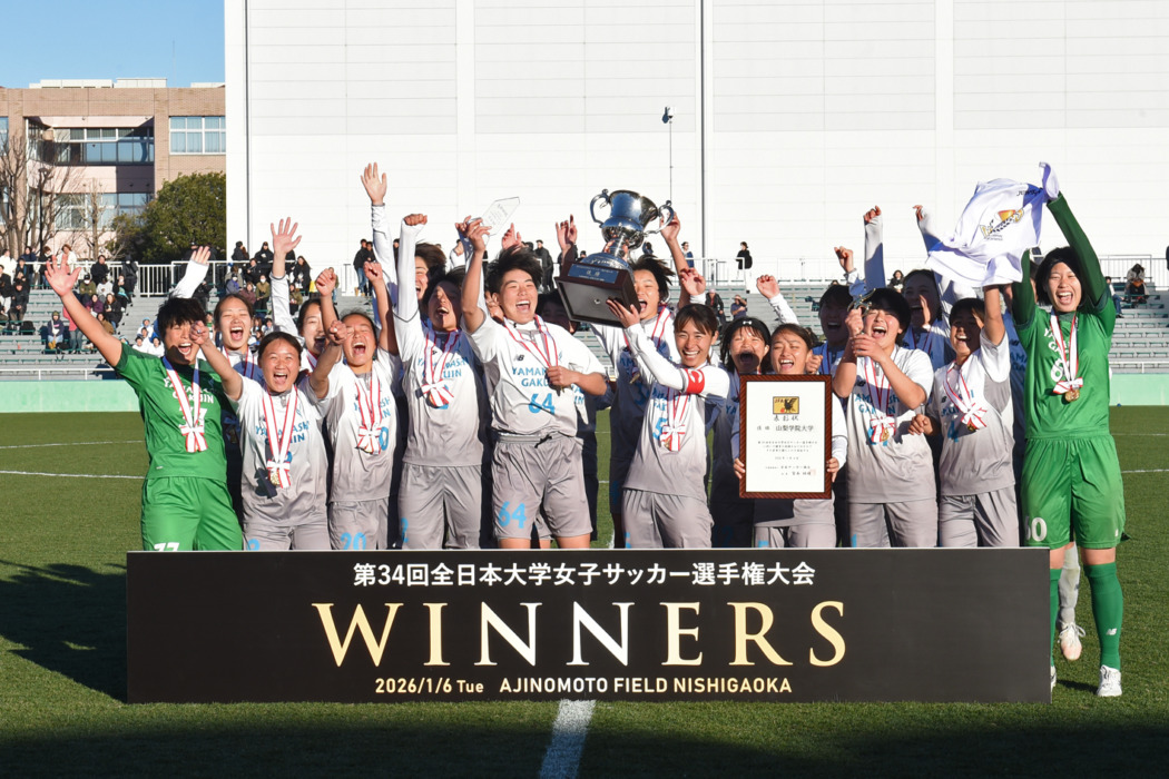 “大学日本一決定戦”「全日本大学女子サッカー選手権」(インカレ)決勝が1月6日、東京・味の素フィールド西が丘で行われた。山梨学院大女子サッカー部は創部10年目だった2年前にこの地で初の大学日本一を獲得し、昨年は決勝で日体大に敗れて2連覇を逃した。選手たちは優勝旗奪還を目標に、この1年間、ひたすら厳しい練習に取り組み力と技とチームプレーを高めてきた。決勝の相手はその日体大。山学イレブンはリベンジを果たすために、リベンジの舞台西が丘の決勝ピッチに立った。前半に加島希夏と寺村穂香が魂のゴールを決め、後半に伊藤琴音が鮮やかなミドルを放ち3得点、日体大に2点を奪われたが、3-2で昨年のリベンジを果たし、大学日本一の優勝旗を奪還した。