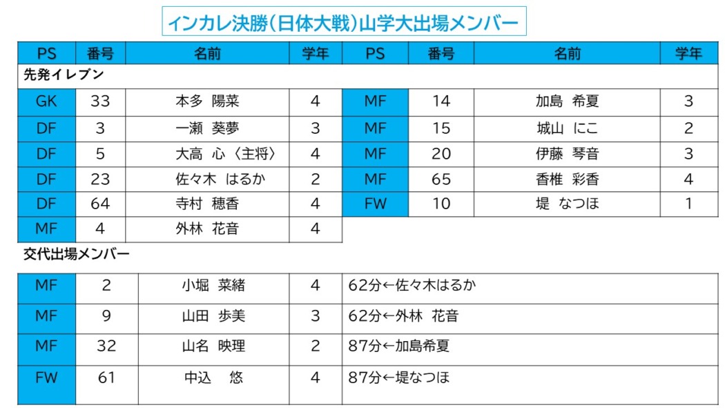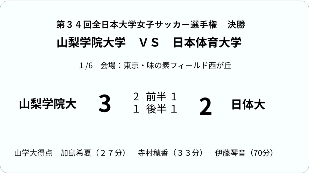 こうして迎えた決勝の舞台、山学イレブンは、白とグレーのセカンドジャージ、日体大は青のファーストジャージで西が丘のピッチに立った。山学イレブンは1年前の雪辱を果たすべく、心の炎(ほむら)を燃やし、燃えて、燃えて、攻めて、攻めて、攻め上がった。前半27分にMF加島希夏(3年)が試合を動かした。ゴール前に詰めて体を投げ出し倒れ込みながら先制ゴールを決めた。31分に強風に煽られ大きく曲がったCKボールを止められずオウンゴールで同点に追いつかれたが、その直後に得たCKで香椎彩香(4年)がニアサイドに絶妙なボールを上げ、マークを外してゴール前に走り込んだDF寺村穂香(4年)がヘッドで合わせて勝ち越した。後半24分にはエースストライカーのFW伊藤琴音(3年)が右足を振り抜き鮮やかにミドルシュートを決めて突き放した。33分に1点差に詰め寄られたが、最後まで日体大に走り勝ち、3-2でリベンジを果たし大学日本一を勝ち取った。山学大の決勝進出は4年連続、準優勝、優勝、準優勝、そして優勝。選手たちは奪還した優勝旗と優勝カップを手に、バックスタンドで「♪さあ 行こうぜ~どこまでも~、走り出せ~走り抜け~」と大声援を送り続けてくれた仲間たちのもとに走った。